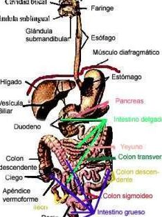 - Intestino grueso: El intestino grueso se encarga principalmente de absorber agua y electrolitos de los alimentos no digeridos y de almacenar los productos finales de la digestión en forma de heces.